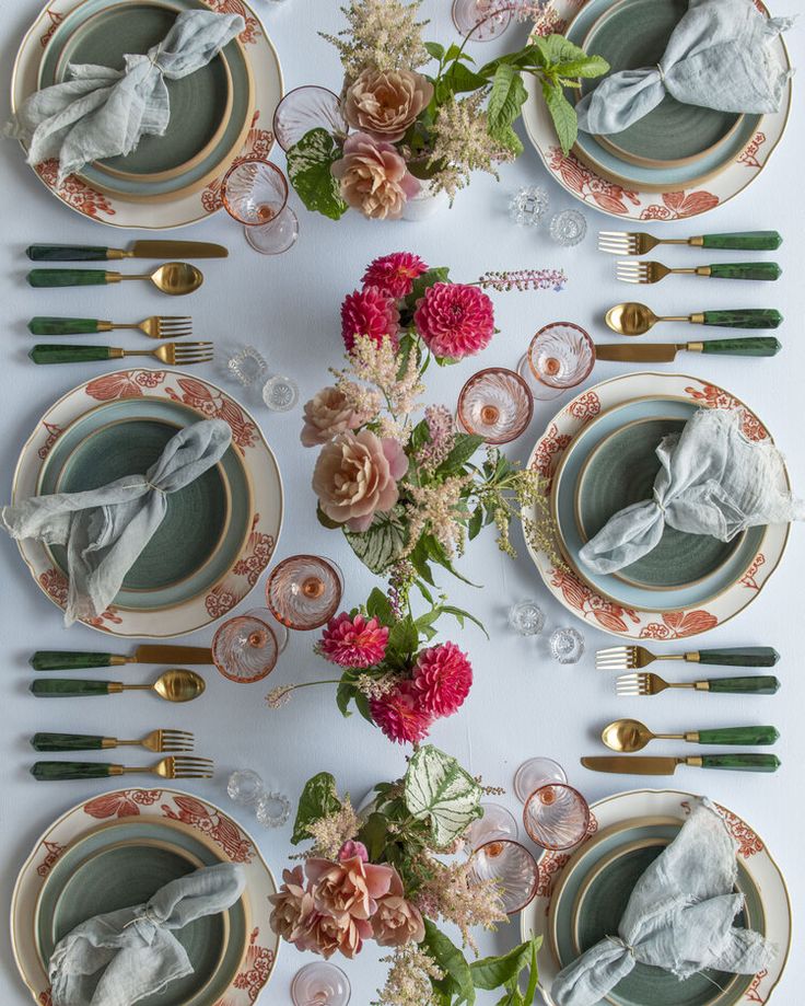 This tableau paints a picture of elegant sophistication with its round plates framed by golden edges, resting on a pink floral tablecloth that sings the tune of spring. The greenery of the napkin ties and the bloom of porcelain flowers add a dimension of garden freshness. It’s classy, it’s boho, it’s a setting that’s beautifully bound in tradition yet whispers the modern minimalist.