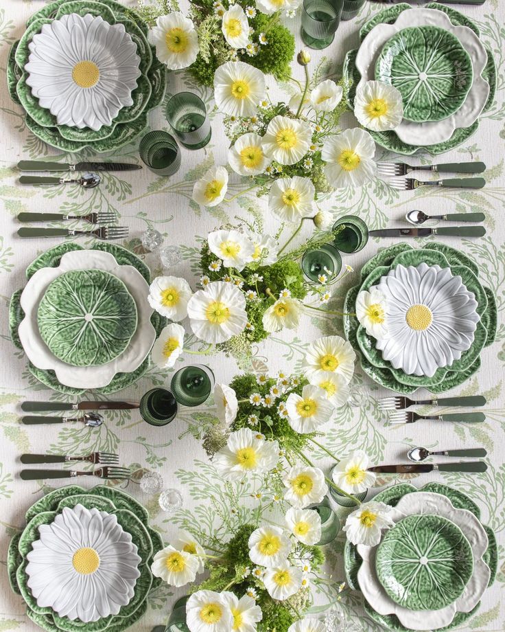 As if plucked from an English garden, this centerpiece is a boho dream with its lush greenery and wildflower charm. The freshness of the table is palpable – plates embossed with floral patterns, glasses with hints of green, and a tablecloth that mirrors the verdancy of a spring meadow. This rustic yet refined setup, where flowers and foliage play the starring role, captures the essence of a spring day in full bloom.