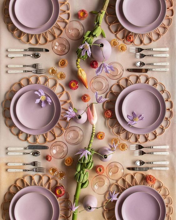 Dive into a pastel dream where simple elegance meets whimsy. Lavender plates nestle within honeycomb-patterned chargers, creating a feast for the eyes. The minimalist approach is evident in the clean lines and modern design, while fresh blooms add a touch of spring’s frivolity. It’s a table that says simple can be striking, and modern can be warm.