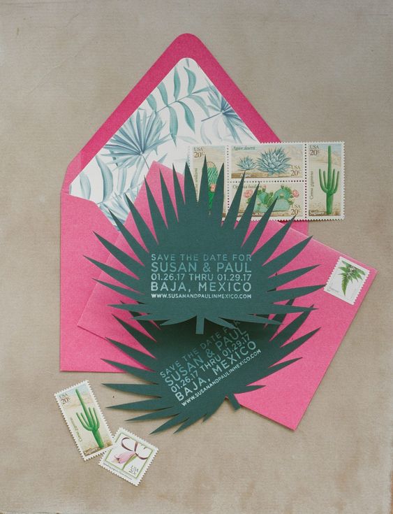 Evoking the warm hues of a desert landscape, this invitation uses vibrant pink and earthy greens to transport guests to an oasis of love. The cactus silhouette against the bold envelope color suggests an adventurous spirit and a wedding that promises to be a destination of joy and unity.