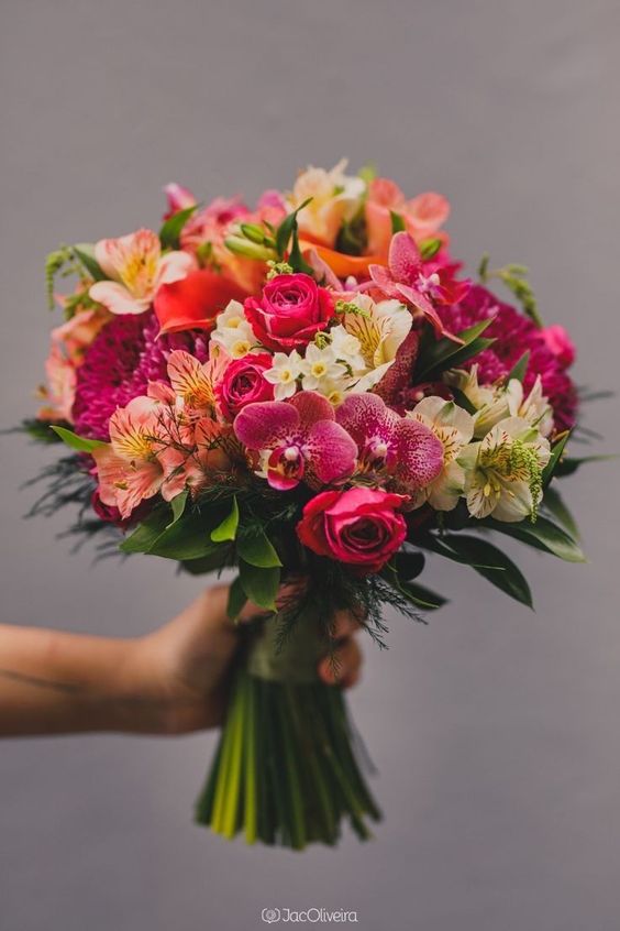 The image captures a bridal bouquet that is a harmonious blend of soft pastels and intense pinks, hinting at the schemes pastels and palette dusty blue trends. This bouquet is a testament to the palette 2024, where delicate alstroemerias and bold dahlias dance amongst lush greens. It’s not just a floral arrangement; it’s a bridal whisper, setting the tone for an enchanting outdoor ceremony.