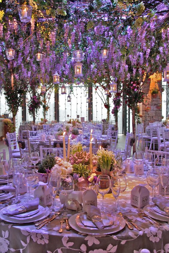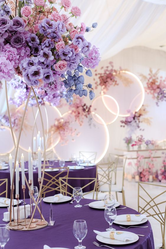 Lastly, the photo depicts an opulent scene with a lush overhead arrangement in lavender and soft pink, set against the dramatic contrast of deep purple table linens. This image is a testament to the schemes 2024, showcasing how bold color choices can coexist with soft floral arrangements to create a unique, modern, and utterly best wedding ambiance. It’s where palette flowers meet dramatic lighting, crafting a palette 2024 that’s as enchanting as it is memorable.