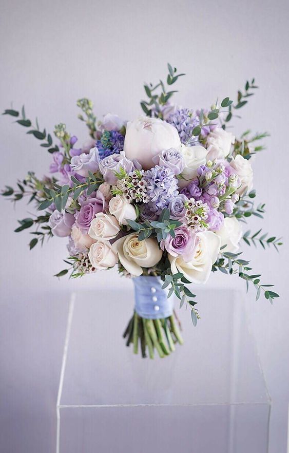 This image presents a bouquet that speaks in soft tones of lavender and lilac, intertwined with the classic purity of white roses. It’s a visual symphony of palette colour schemes, where the cool hues of purple suggest tranquility and grace, setting a theme of understated elegance for the springtime bride.