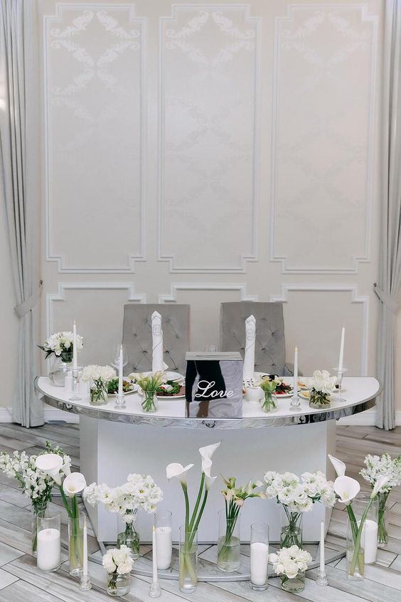 Contrast is key in this image, where the starkness of a white, modern setting is softened by delicate floral arrangements. It’s a bold statement in modern wedding design, showcasing how a minimalist approach can still embody the warmth and richness of a spring palette, particularly with the inclusion of palette flowers in understated yet impactful arrangements.