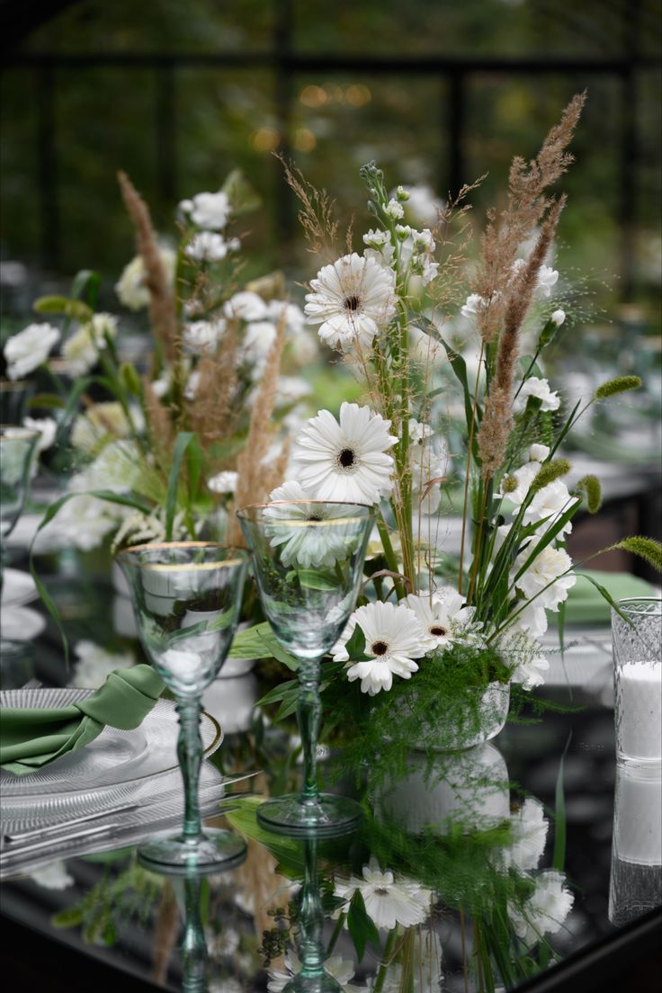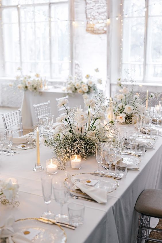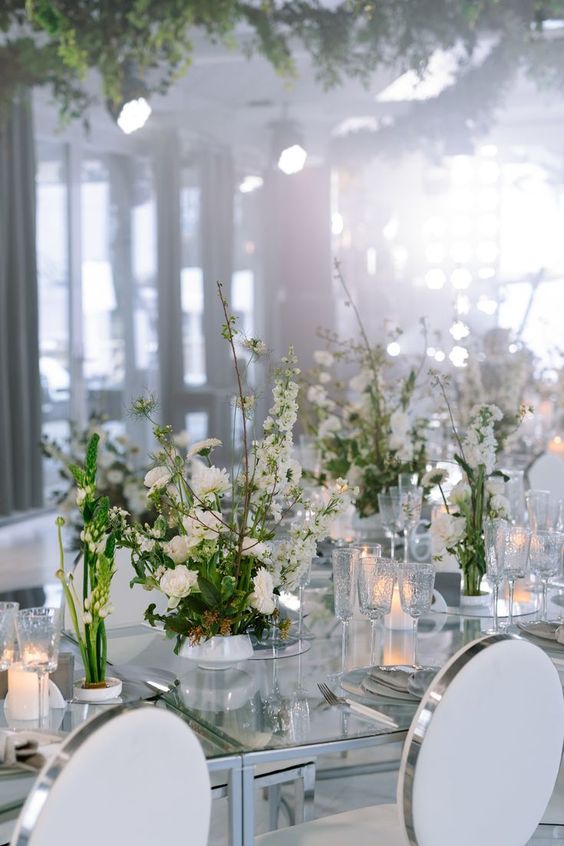The picture depicts a table setting that brings the outside in, with white blooms and greenery that evoke a winter landscape reborn in the spring. This palette harmoniously blends the remnants of winter white with the fresh green of new beginnings, making it a unique choice for early spring nuptials.