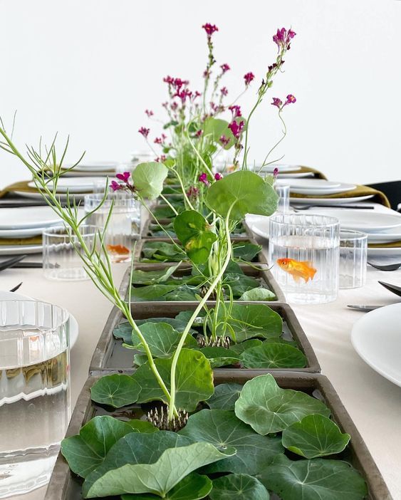 This photo takes a unique turn, presenting a tablescape where vibrant greenery is accented by pops of pink flowers. It’s a playful yet refined palette, illustrating how spring can be a time for both growth and the joy of color, making it an excellent choice for couples looking to bring a sense of life and vibrancy to their table settings.