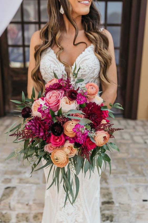As if nature herself were a guest at this wedding, the bouquet in the photo exudes a rustic charm, perfectly aligning with the schemes rustic of the season. The deep reds and soft peaches are the epitome of a palette bridesmaid dress, offering a look that is both grounded and ethereal—a fitting tribute to the rustic yet modern couple.