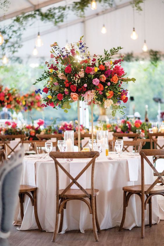 This image showcases an elevated floral centerpiece, a spectacle of palette flowers that speaks volumes of the trends 2024. With a towering presence, it pairs the vibrancy of the garden with the sophistication of an indoor setting, creating a unique theme that marries the best of both worlds.