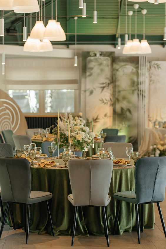 The final image presents a reception setting that whispers sophistication with its understated palette dusty blue and green tones. It’s a modern take on a traditional celebration, where every detail from the tablecloth to the floral centerpiece exudes elegance, perfect for the groomsmen and bridesmaids to revel in style.