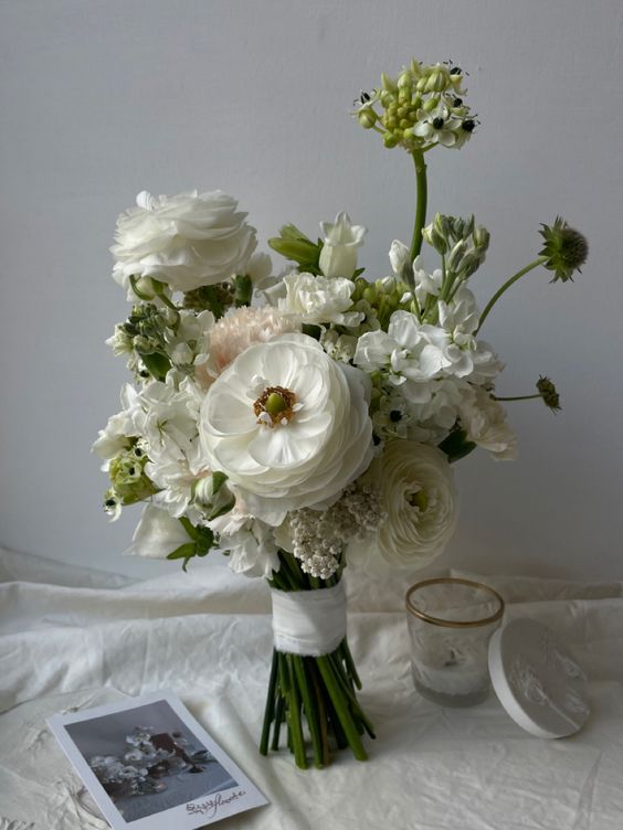 In this image, purity and simplicity speak volumes with a bouquet awash in shades of white. From the satin-like petals of the ranunculus to the spiky allure of the veronica, this arrangement celebrates the timeless appeal of monochrome, making it a perfect reflection of palette bridesmaid dress trends. It’s a nod to tradition with a whisper of modern sophistication, setting a serene and graceful tone for the nuptial celebration.