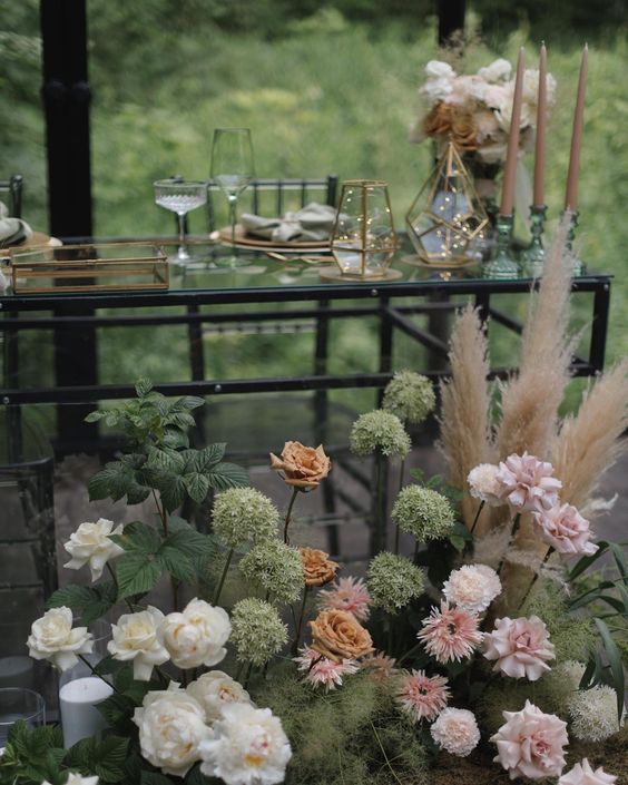 Here, a verdant collection of foliage and flowers presents a casual yet chic centerpiece, drawing from the palette green trend. This arrangement, with its free-spirited mix of textures and shades of green, captures the essence of boho style, ideal for a laid-back yet stylish outdoor reception. The clear and green glassware adds a touch of refinement, demonstrating how schemes blue can be woven into even the most bucolic settings.