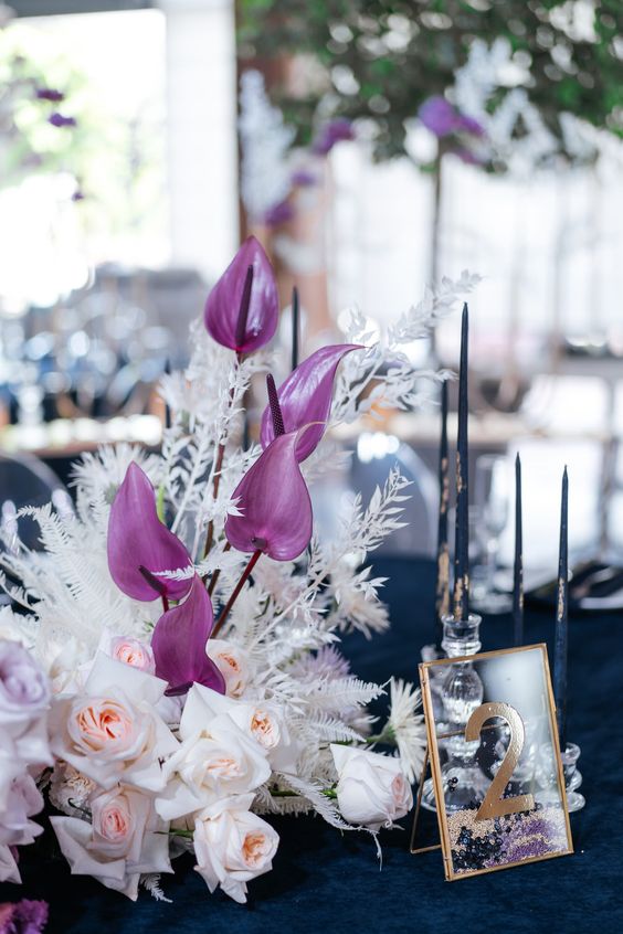 The image exudes a regal charm with a centerpiece dominated by striking purple calla lilies, which stand out against the delicate white frost of companion blooms. This setting is a bold take on the palette 2024, where purple symbolizes the unique and luxurious aspect of palette colour schemes. It’s a royal statement that promises to leave an indelible mark on the theme of any wedding.