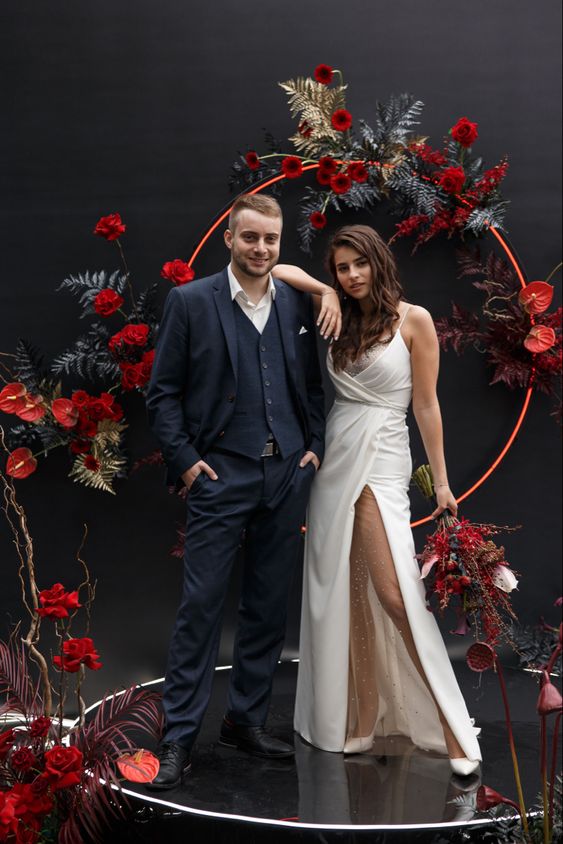Modern elegance is captured in this monochrome setting, where the bride and groom stand against a backdrop of dramatic reds and blacks. This couple embodies the spring wedding colors trend of 2024, with the groom in navy and the bride in a sleek white dress with a daring slit. The floral arrangement, with its vivid reds and dark accents, adds a romantic depth to their trendy and stylish look.