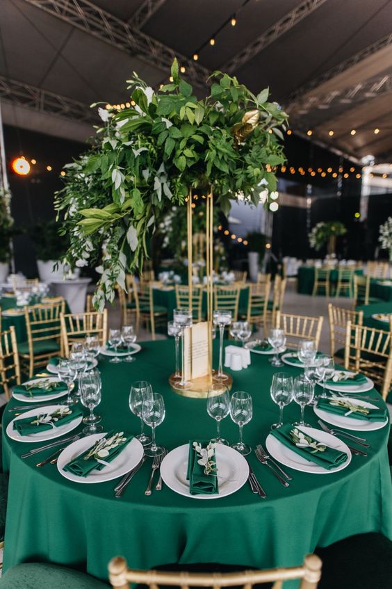 As we delve further into the spring wedding colors trend of 2024, we encounter a vibrant tablescape where green is the star. Towering centerpieces of lush foliage rise above tables cloaked in emerald linens, creating a canopy of natural splendor. This setting is a nod to the colour palettes green movement, where the vitality of nature takes center stage, embodying the freshness of April and the verdancy of an outdoor celebration.