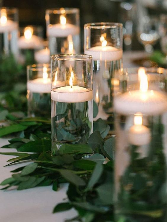 A runner of eucalyptus leaves stretches along the table, interspersed with the gentle glow of candlelight, setting a romantic mood that’s both earthy and enchanting. This design leans into the trendy rustic aesthetic, perfect for those seeking a simple yet elegant spring wedding ambiance. The soft light reflects the neutral palette’s versatility, proving that spring wedding decor can be both understated and striking.