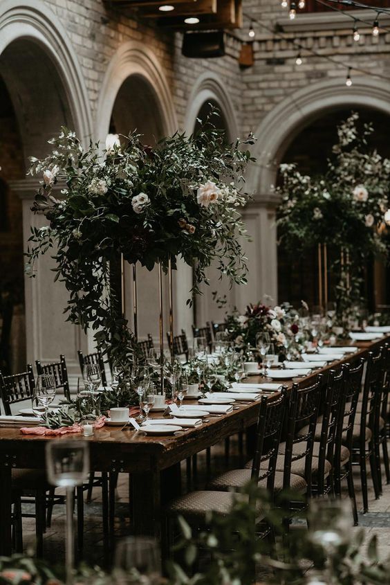 The rustic charm of wooden tables set against the gothic architecture of an indoor venue presents a marriage of styles that is uniquely 2024. Floral arrangements erupt with life, towering above the guests, creating a wild and romantic atmosphere. This setting captures the essence of a red barn wedding translated into an elegant, historical setting, ideal for those who appreciate the beauty of past and present.
