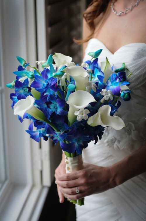 Held in the hands of a bride, the bouquet is a vivid declaration of personality and style. This particular arrangement is a stunning example of the spring wedding colors trend of 2024. With an electric mix of navy and sky blue orchids intertwined with pristine neutral calla lilies, it’s a floral choice that speaks volumes about the bold and expressive trendy nature of the couple. The blues are a nod to the dark teal trend, while the white offers a classic champagne elegance, blending the colour palettes green with the vibrancy of spring.