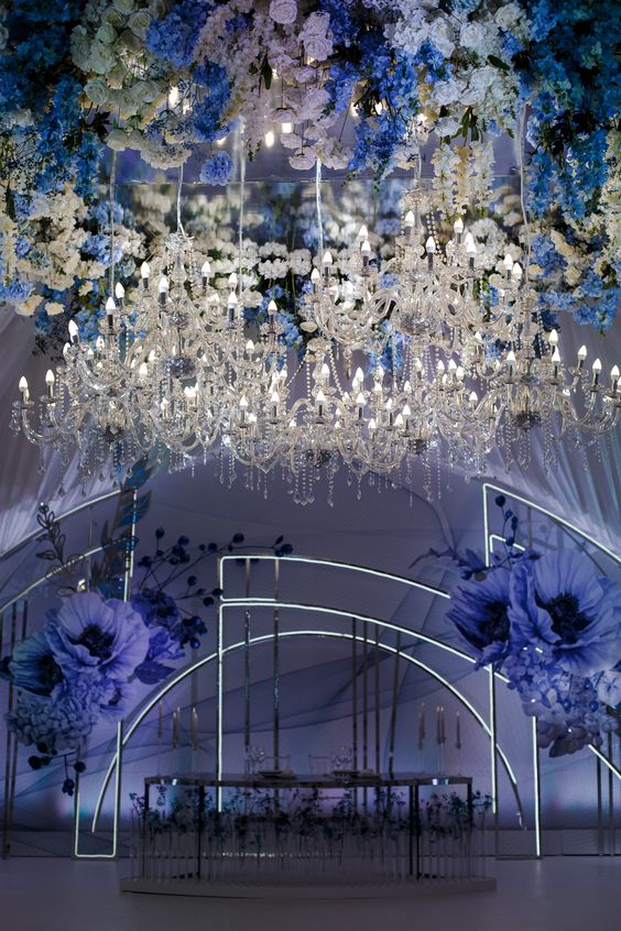 Here, a grand chandelier bedecked with green, white, and navy florals illuminates a space with pure elegance. The deep blues and greens against the white create a trendy yet romantic ambience, reflecting the spring wedding colors trend of 2024. It’s a luxurious nod to the dark teal and green hues that are poised to dominate spring weddings, offering a sophisticated palette for the modern couple.