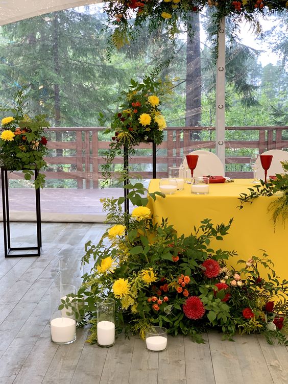 Embracing the brightness of the season, this setting showcases a vibrant yellow that instantly brings a smile. This cheerful setup embodies the spring wedding colors trend of 2024 with its bold use of yellow, juxtaposed with rich red and green florals. It’s a perfect example of colour palettes green bringing a zest of life to a rustic or outdoor wedding, creating a lively and joyful atmosphere.
