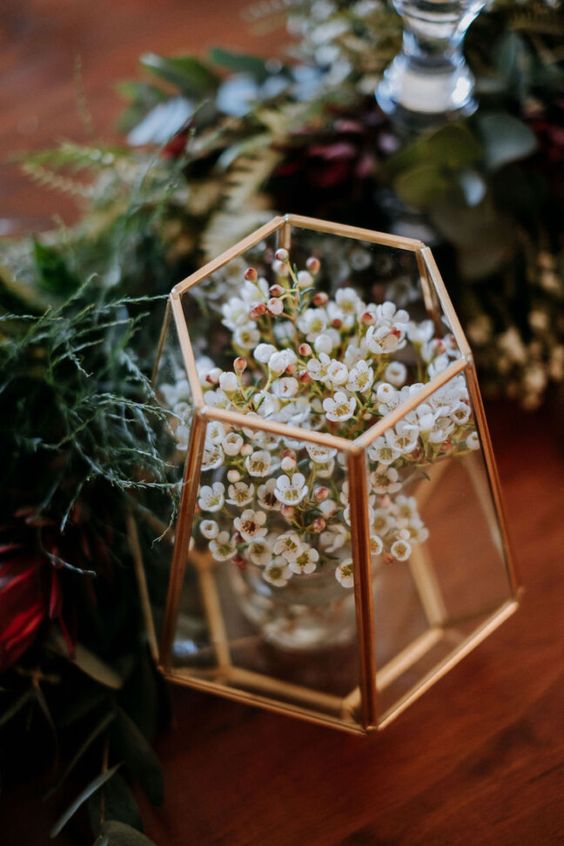 In the delicate interplay of geometry and flora, we discover a centerpiece that is both modern and whimsical. A geometric gold terrarium encapsulates a spray of dainty white flowers, creating an exquisite focal point that suggests a balance between structured design and the untamed beauty of nature. This piece is an ideal match for the couple who appreciate the blend of contemporary lines with the softness of nature’s gifts.