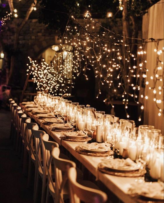 As dusk falls, an enchanted scene comes to life under a canopy of twinkling lights. A long table, set with gold and white, glows with the light of countless candles, inviting guests to a night of warmth and festivity. This setting is perfect for an evening reception, where the soft golden light of candles and string lights combine to create a starry night effect, enchanting all who gather to celebrate.