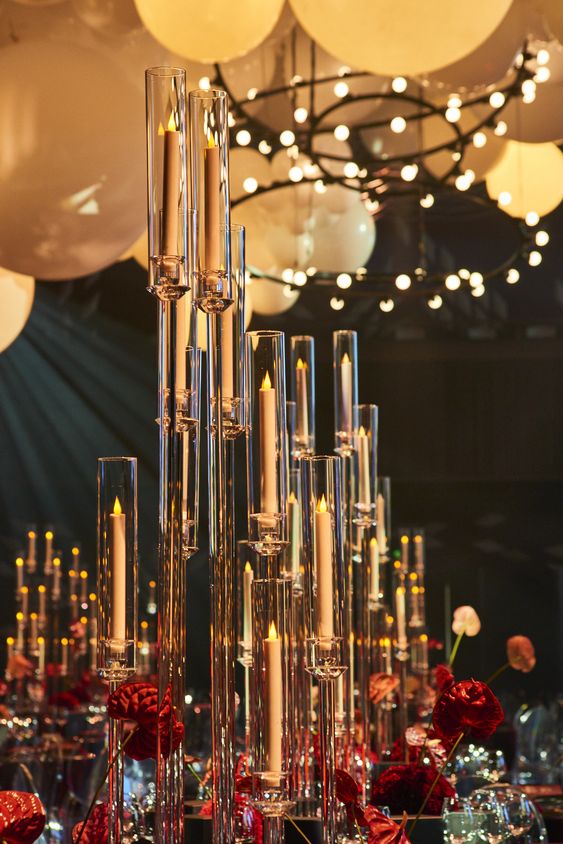 In a room filled with reflections and light, towering glass cylinders rise like modern sculptures, their flames casting a warm glow over a sea of gold. This decor choice is for the couple who are drawn to clean lines and reflective surfaces, a symbol of a love that is clear, strong, and luminous.