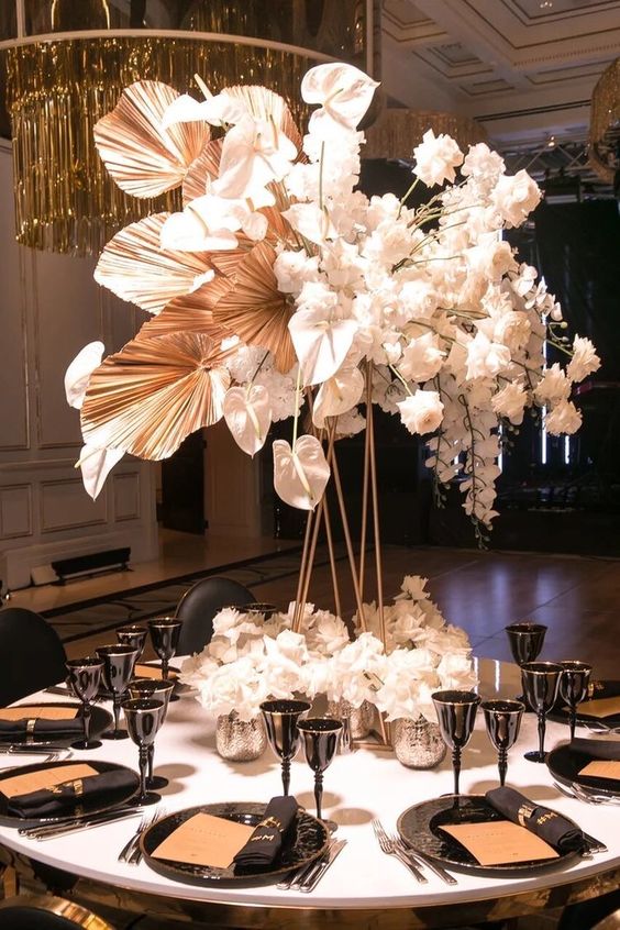 Gold takes on a botanical form in a breathtaking display of oversized metallic flowers, their petals unfurling amidst a garden of white blossoms. This centerpiece is a bold statement of luxury and beauty, the epitome of gold wedding decor 2024, perfect for a couple who desires their wedding to be a grand affair, remembered for its striking and luxurious floral artistry.