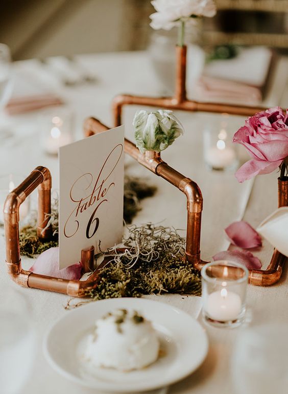 The rustic charm of copper and the gleam of gold unite in a display that sings of earthy elegance. Here, a simple white card stands, its calligraphy a dance of grace among the raw beauty of copper piping. It’s a tableau that speaks to the couple who finds beauty in authenticity, with moss and petals scattered in a celebration of nature’s own decor. Candles flicker within their glass havens, a reminder that even in something as raw as a copper frame, there’s a place for the luster of gold.