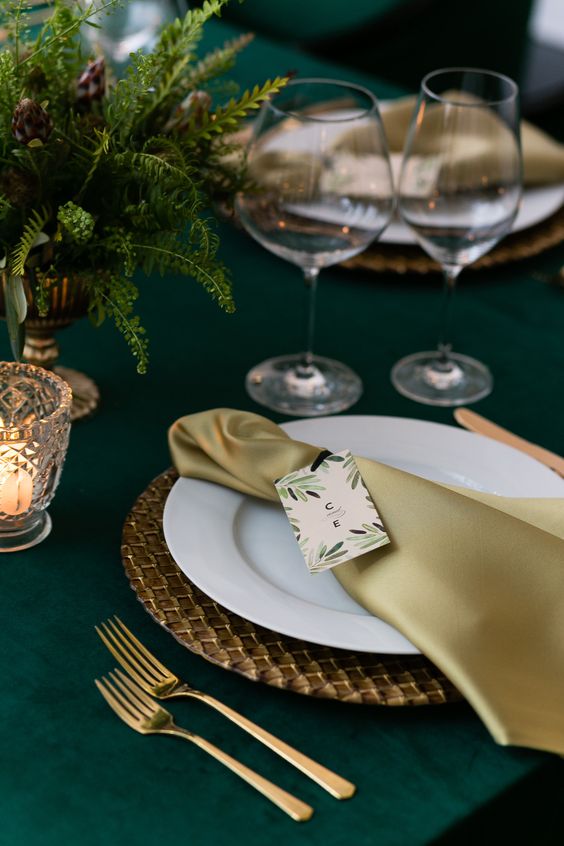 The richness of emerald green combined with the glitz of gold presents a tablescape that feels like a lush forest kissed by a golden sunset. The deep green tablecloth serves as the forest floor upon which golden plates sit like sunlit clearings. Gold flatware shines against the emerald backdrop, complementing the natural greenery that spills out of the centerpiece with vitality. The soft golden glow of the candle votives adds a magical touch, while a satin napkin in a gentle shade of sage green ties the ensemble together, showcasing a marriage of nature and luxury.
