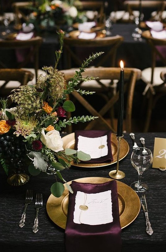 As we step into the realm of nuptial grandeur, a spectacular scene unfolds where black and gold converge to create a majestic setting. Imagine an elongated table, its surface gleaming with a polished dark finish that whispers tales of midnight elegance. Atop, a runner of sheer, gossamer fabric billows softly, laying the foundation for a stunning array of gold-accented candles and florals. Blooms in hues of purple and, burgundy and, and forest green stand proudly among tapered candles, their flames dancing gently in the soft glow. Each place setting, with its sleek black plates and golden cutlery, invites guests into a world where every detail is a statement of opulence. This is more than a meal; it’s an experience wrapped in the luxe embrace of gold wedding decor 2024.